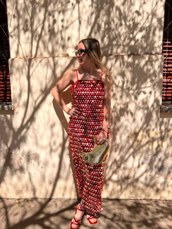 Vestido largo confeccionado con lentejuelas bordadas, spandex y forro interno