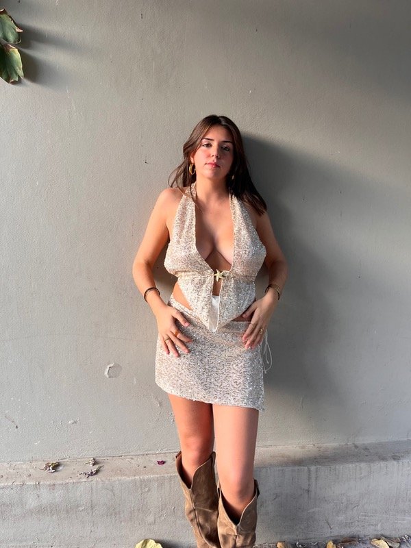 Top & mini en lentejuelas bordadas con hebilla labrada.Talle unico, S al L aproximadamente